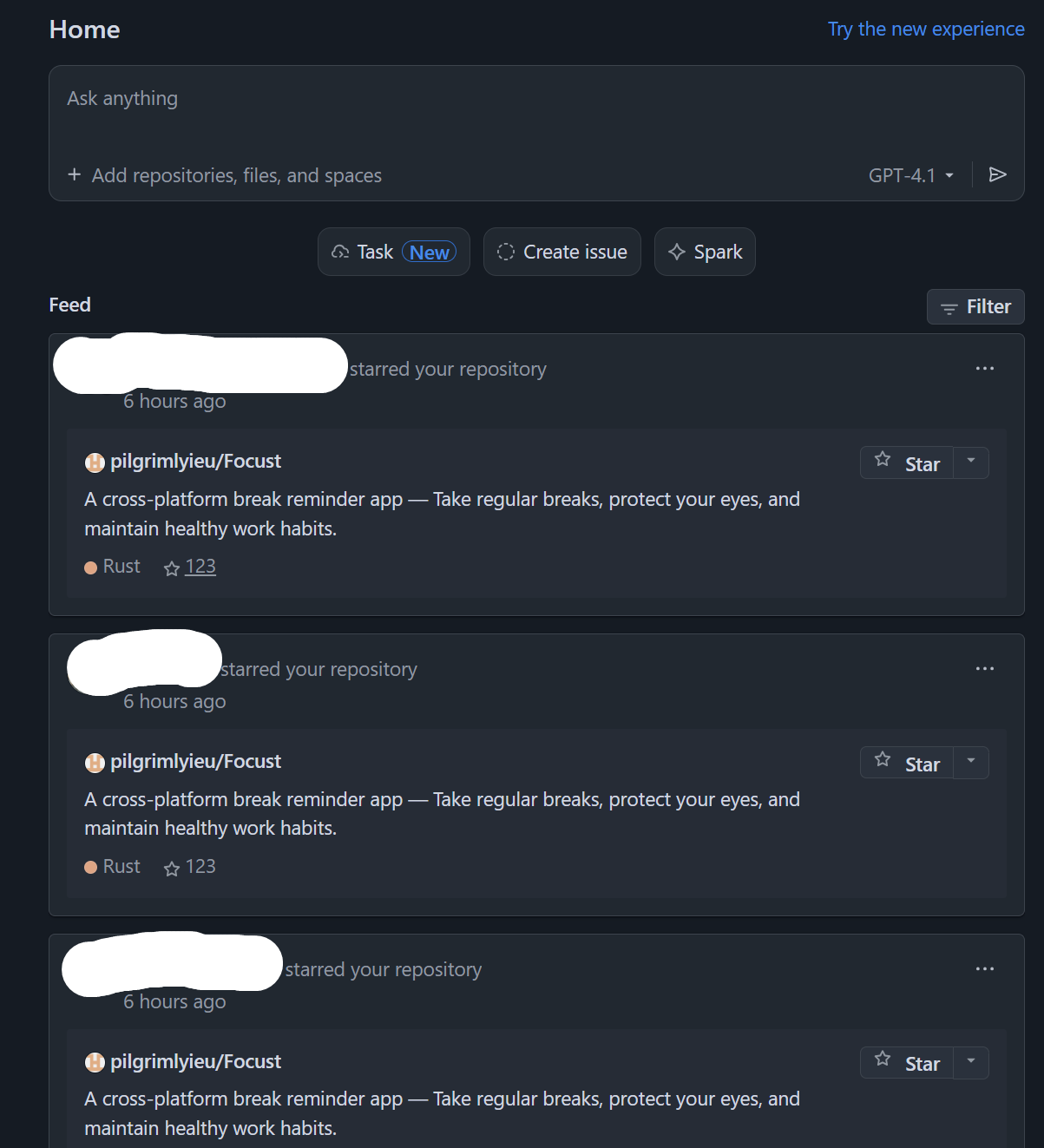 故事开始于 11 月 26 日早上。当我像往常一样打开 GitHub 时,通知栏里那一连串的 Star 消息瞬间占据了我的视线。我的项目 Focust 在短时间内突然增加了 123 个 Star。