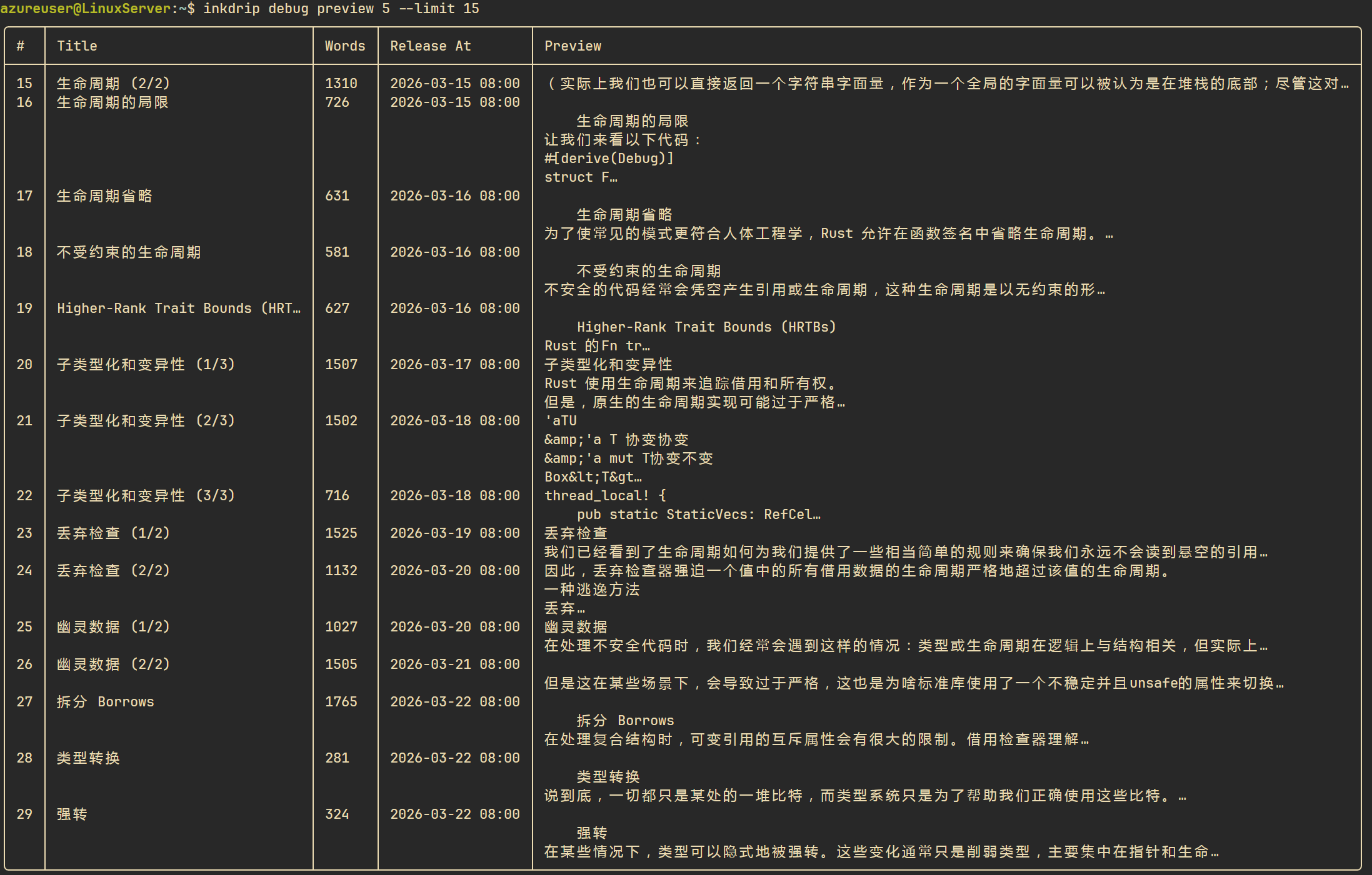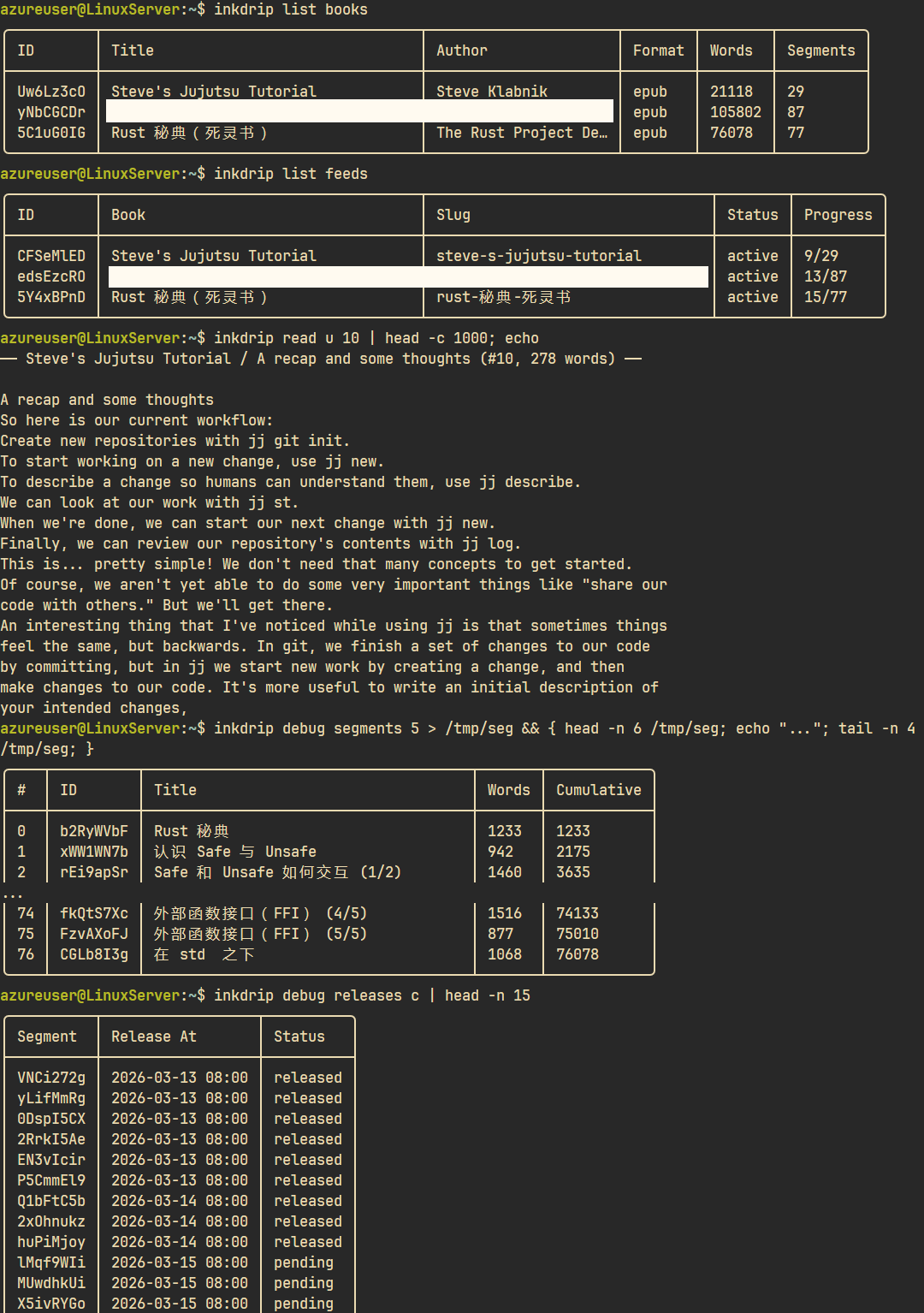 想到就干,有了想法后虽拖延了几天,但还是在寒假最后几天疯狂消耗额度做完了雏形。然后再开学拖了一周审核、优化了代码,3.6 推送了第一个提交,然后开源了在了 GitHub:pilgrimlyieu/InkDrip: Turn books into RSS feeds — drip-feed your reading. Support EPUB, Markdown and TXT formats.。