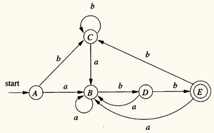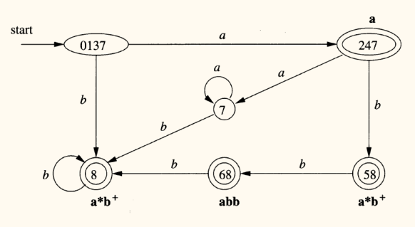 :这是另一个接受状态集合。虽然有两个状态,但它们都对应于同一个模式a*b+