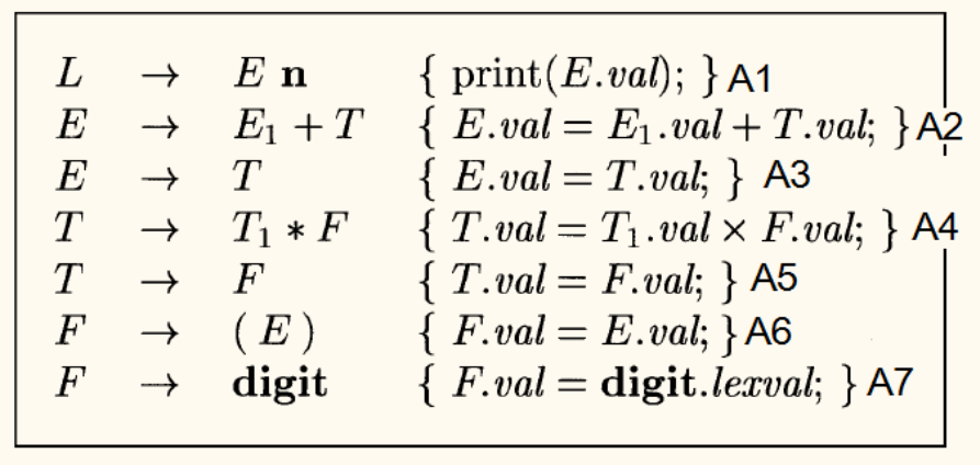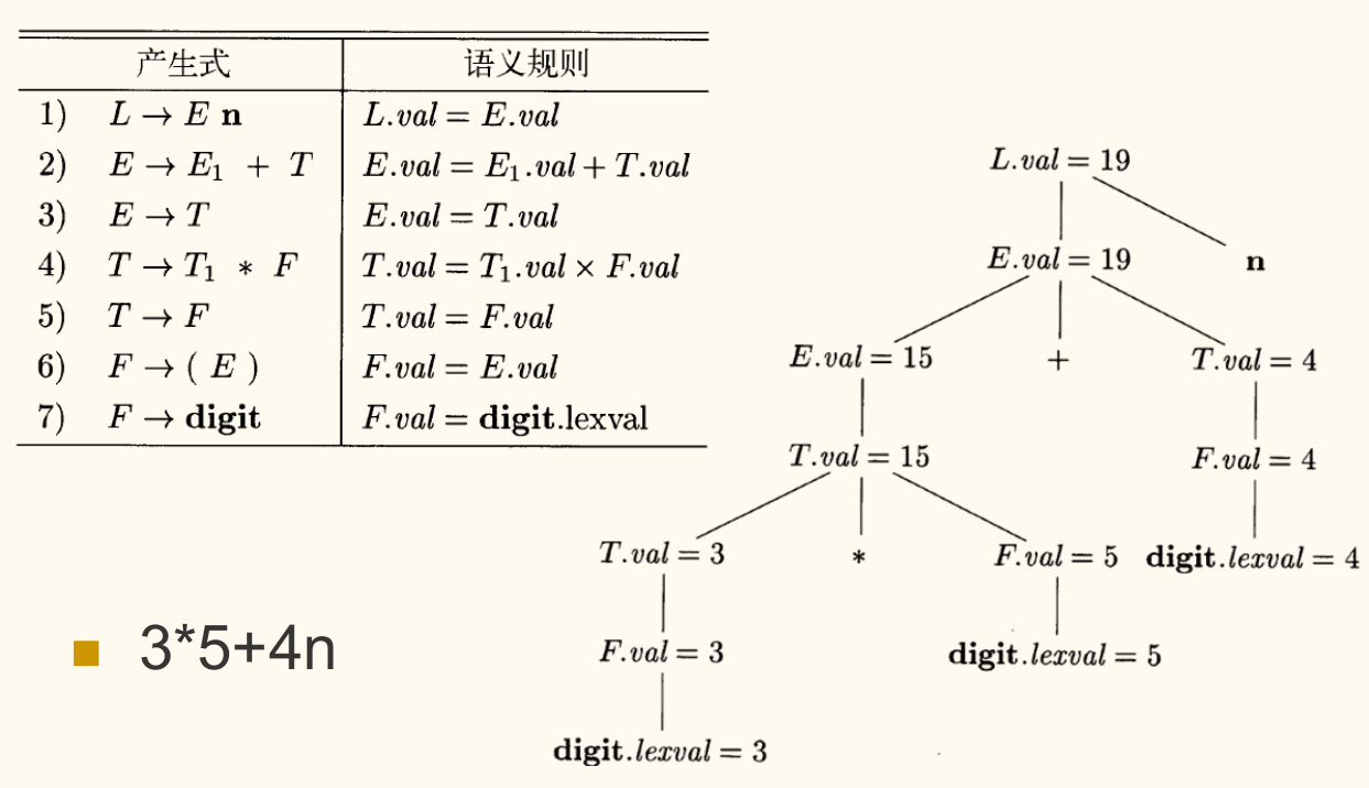 在这个例子中,所有非终结符()都只有一个综合属性 。每个产生式头的 属性都是由其产生式体中符号的 属性计算得出的。
