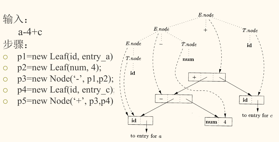 - 基本实现:可以先构造完整的语法分析树,然后将语义动作作为额外的子节点插入。对这棵新树进行深度优先遍历,在访问到动作节点时执行它。
