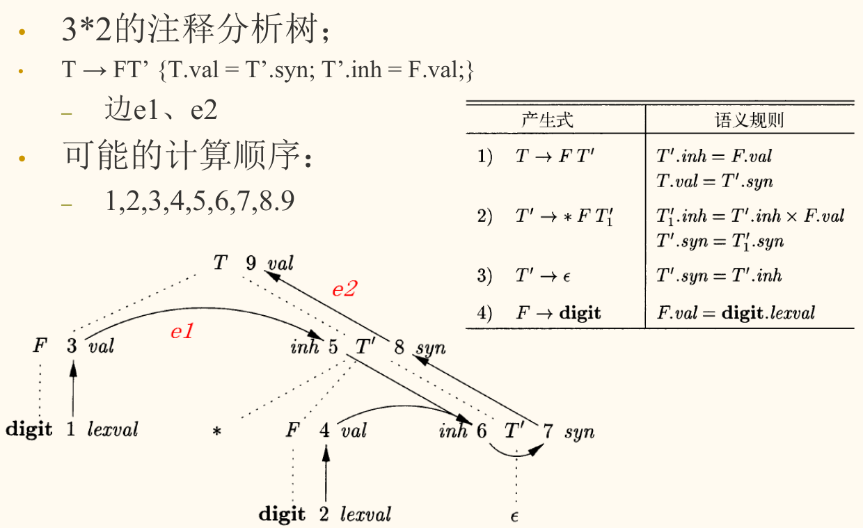 - 语义规则(Semantic Rules):与每个产生式相关联,用于描述如何计算该产生式中符号的属性值。