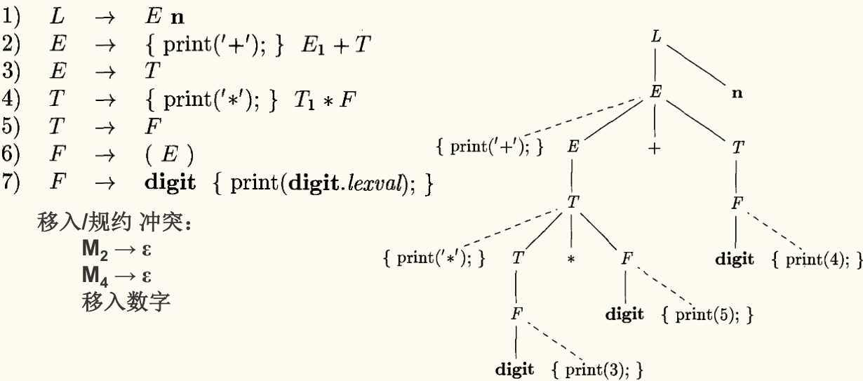 - 在自底向上分析中:分析中,当动作之前的所有符号都被处理并移入栈顶时,该动作被执行。这会使实现变得复杂,一种常见的技巧是,将动作