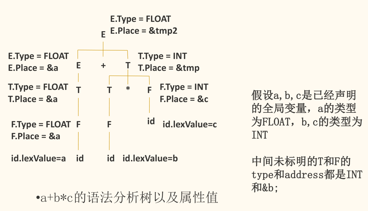- 属性(Attributes):与每个文法符号(终结符或非终结符)相关联的值。例如,一个表示表达式的非终结符 可能有一个 属性表示表达式的值,以及一个 属性表示其类型。
