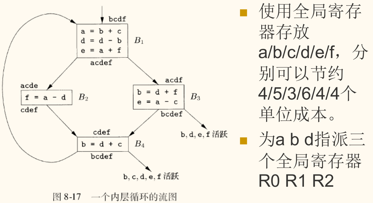 前面讨论的算法是针对单个基本块的。当程序的控制流跨越多个基本块时,尤其是在循环中,我们需要一种全局寄存器分配(Global Register Allocation)策略。