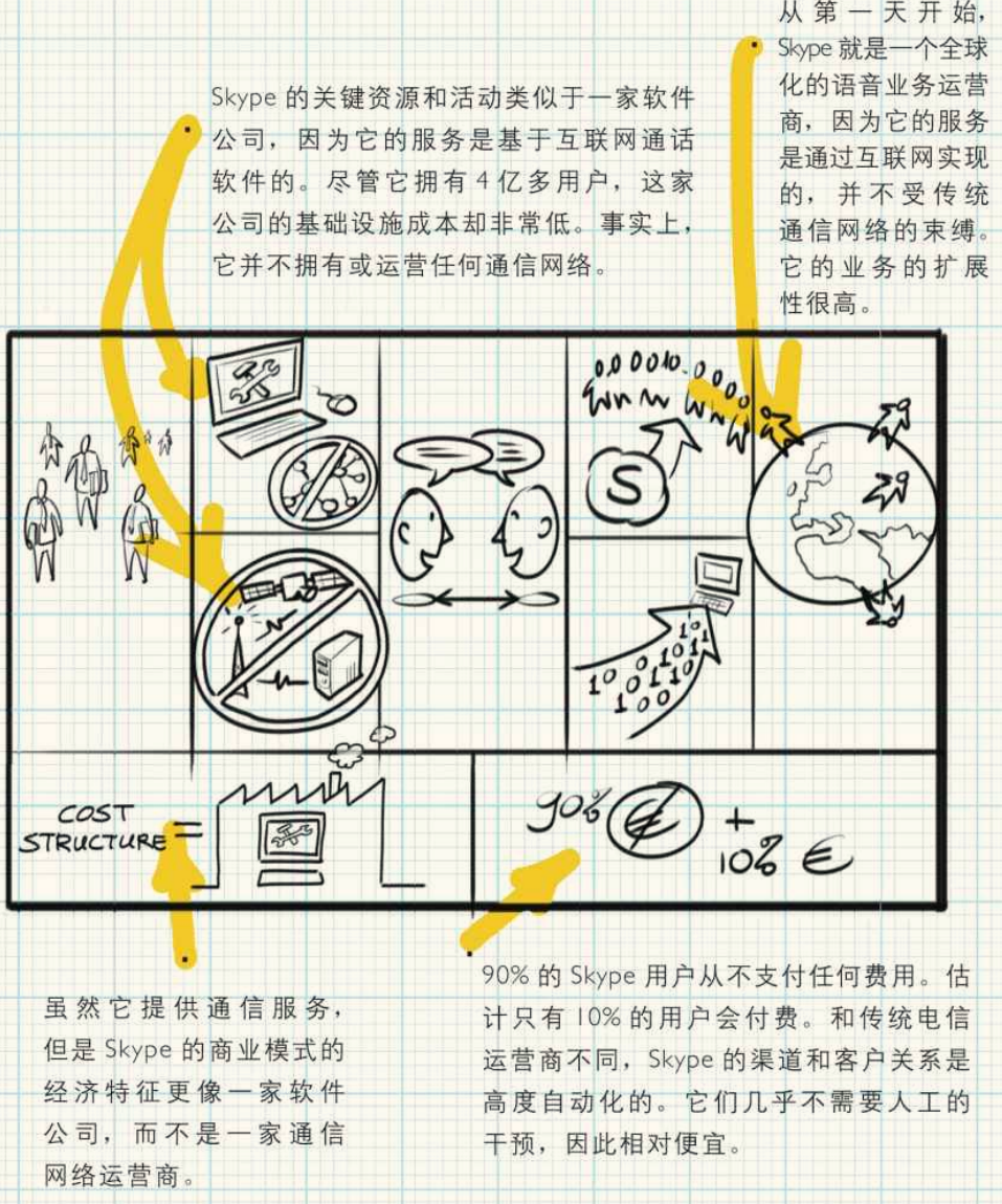 通过这种方式,即使不看详细的文字,也能在瞬间理解 Skype 商业模式的核心特征。