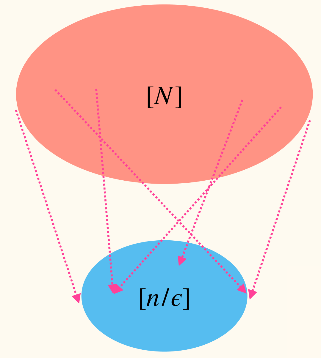 选取 2-universal 哈希 h : U → [ n / ε ] h\colon U \to [n/\varepsilon] h : U → [ n / ε ] 。在小全集 [ n / ε ] [n/\varepsilon] [ n / ε ] 上维护一个精确的集合数据结构。