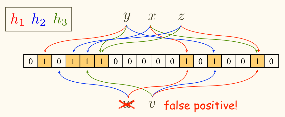 假阳性率为 ε \varepsilon ε (因为对于 x ∉ S x \notin S x ∈ / S ,h ( x ) h(x) h ( x ) 与集合中某个 h ( x i ) h(x_i) h ( x i ) 碰撞的概率约为 n / ( n / ε ) = ε n / (n/\varepsilon) = \varepsilon n / ( n / ε ) = ε )。