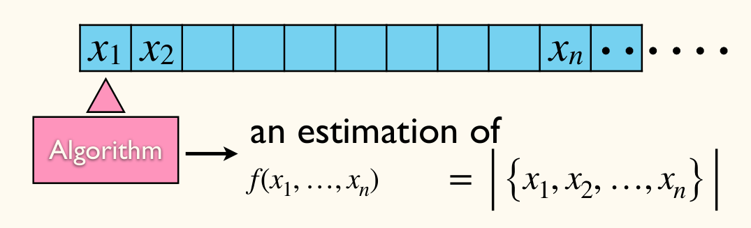 在大数据场景下,数据往往以数据流 (Data Stream)的形式到达——元素 x 1 , x 2 , … , x n x_1, x_2, \ldots, x_n x 1 , x 2 , … , x n 逐个到来,算法只能以有限的内存单遍扫描数据。精确存储所有信息需要 Ω ( n ) \Omega(n) Ω ( n ) 空间,但 sketch 只使用亚线性 (sublinear)甚至 O ( log n ) O(\log n) O ( log n ) 的空间,代价是允许近似误差。